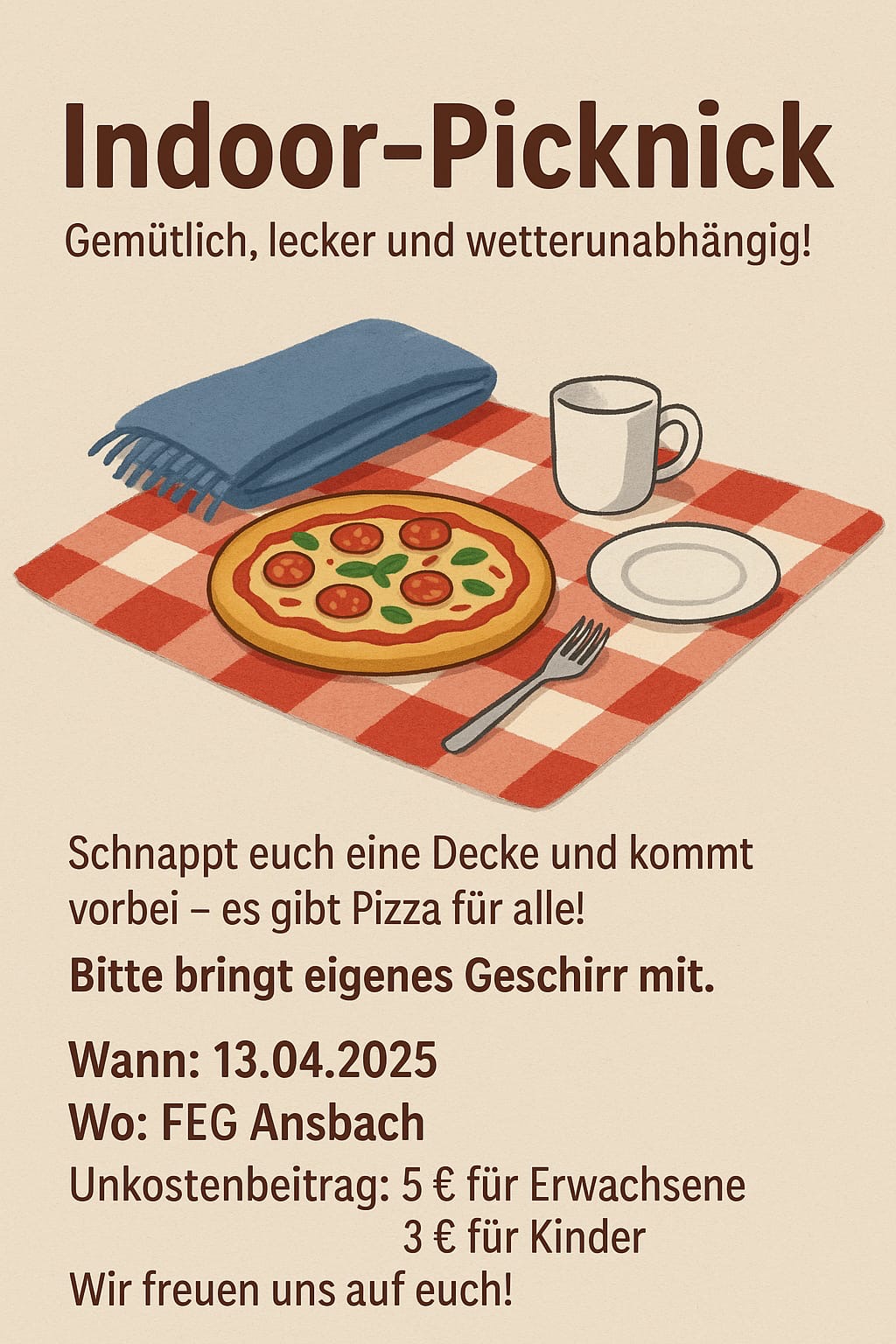Indoor-Picknick nach dem Gottesdienst 5. April 2025 by Wolfgang Heubeck Kalender Zum Kalender hinzufügen Zu Timely-Kalender hinzufügen Zu Google hinzufügen Zu Outlook hinzufügen Zu Apple-Kalender hinzufügen Einem anderen Kalender hinzufügen Als XML exportieren Wann: 13. April 2025 um 12:00 2025-04-13T12:00:00+02:00 2025-04-13T12:15:00+02:00 Wo: in unseren Gemeinderäumen Johann-Sebastian-Bach-Platz 7 91522 Ansbach Deutschland Kontakt: Ela Bodnia-Stock E-Mail sonstige Termine